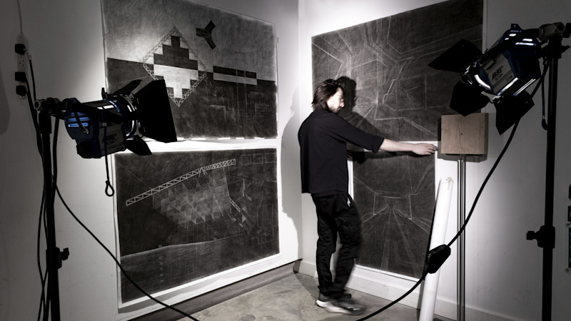 Charcoal erasure exploring the selective demolition and transformation of existing elements. Solids are removed or rendered translucent, while structures become flexible backdrops for set construction.